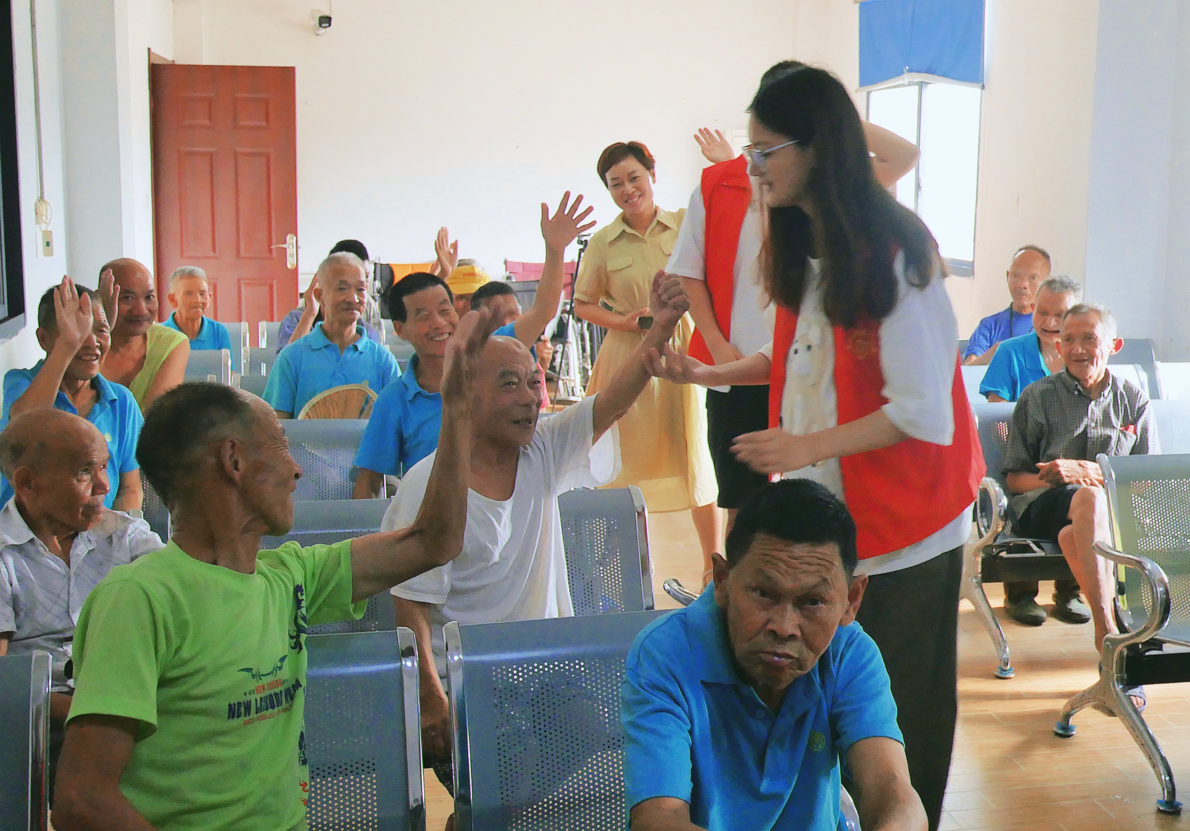 7月20日,团队来到匡河镇福利院,通过陪伴老人聊天、健康知识宣讲、智能设备使用指导、趣味小游戏互动等方式开展志愿活动。尤其是在趣味小游戏环节,团队成员积极引导、鼓励老人们团队合作参与游戏,使老人们深切感受到温馨友爱的互助氛围。福利院经理汪勇在与团队成员座谈时表示,“在院里,老人的基本生活虽然得以保障,但由于受到的社会资助有限,尤其老人无亲属陪伴,精神需求往往难以满足,同学们来这里陪老人聊聊天、做活动,通过这种方式有效地解决了这个难题,实在是太好了!”