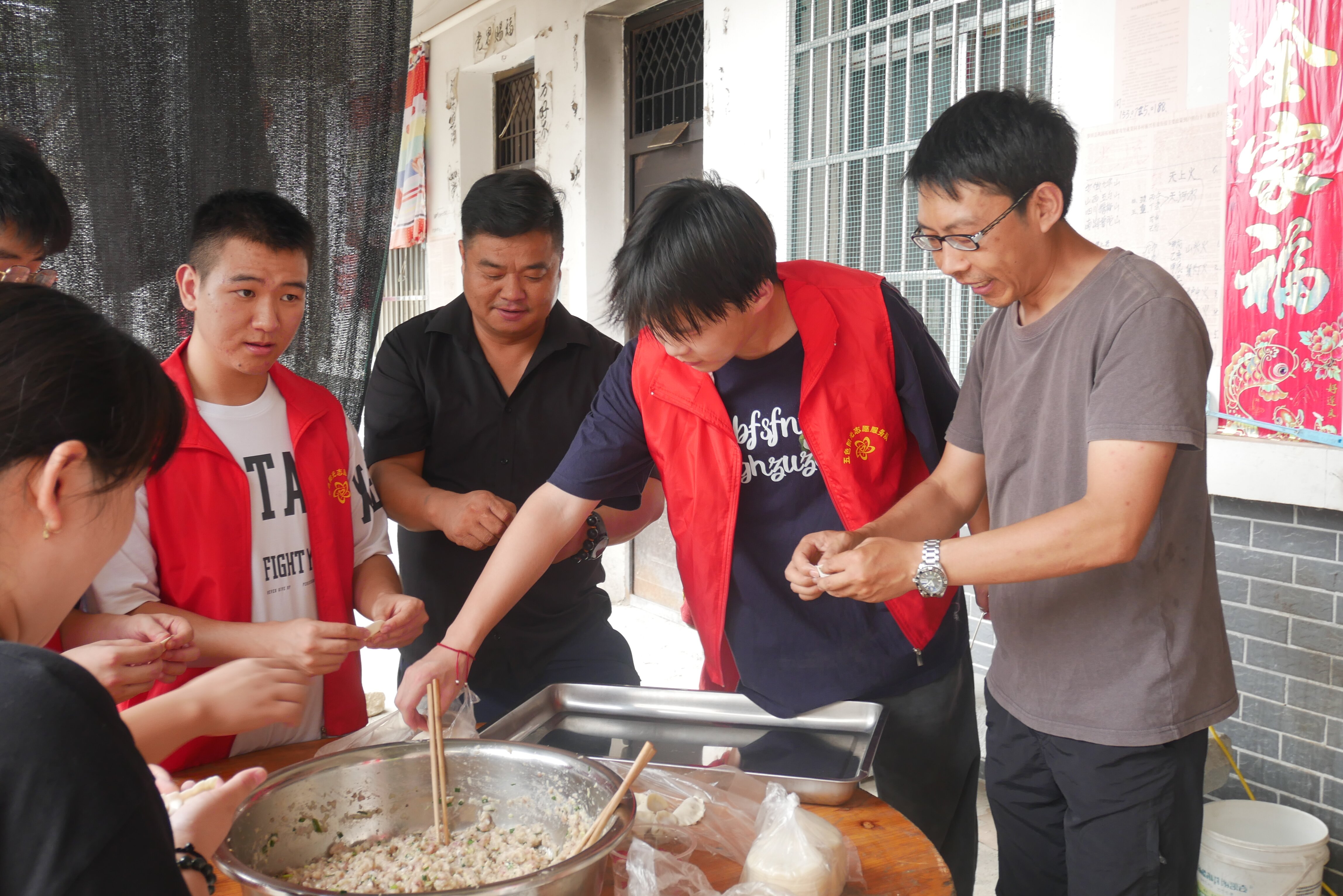 7月21日,在村委干部和公司驻村工作队的帮助下,团队成员来到张家河村五保户安置点,开展了“同吃一桌饭 共叙邻里情”活动。安置点的老人们和实践队员们一起擀饺皮、包饺子,还在院子里热心地搭起了饭桌大棚,大家都忙得不亦乐乎。一顿饺子下来,既让老人们感受到了来自各方的温暖和关怀,也充分调动了老人们参与互助活动的积极性。安置点的冯爷爷表示,“匡河镇这一带大大小小50个村庄基本都设有安置点,我们这个安置点的老人大多都比较热心,住在一起就是家人、朋友,应该相互扶持。”