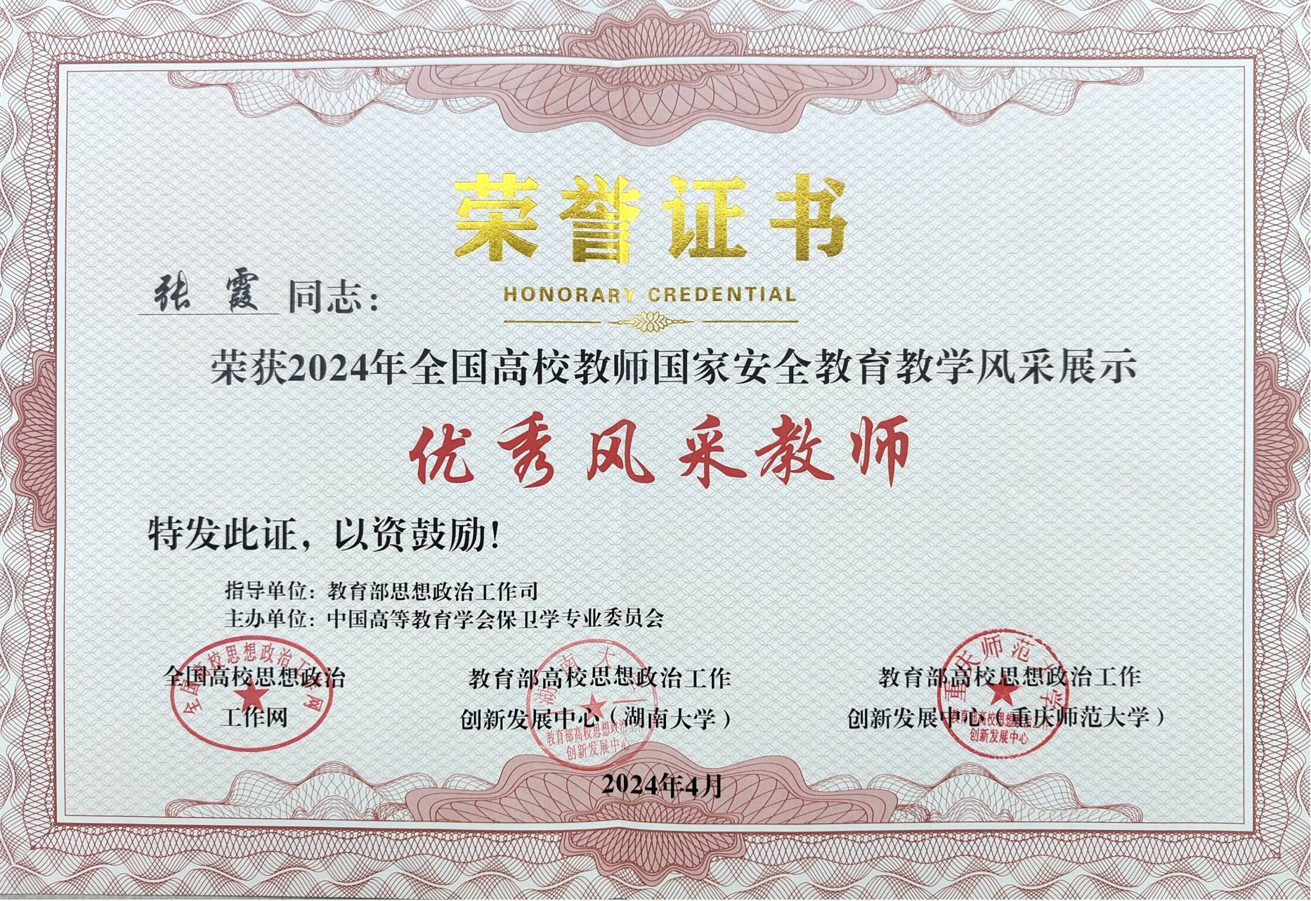yl23455永利张霞教师获得优秀风采教师荣誉。