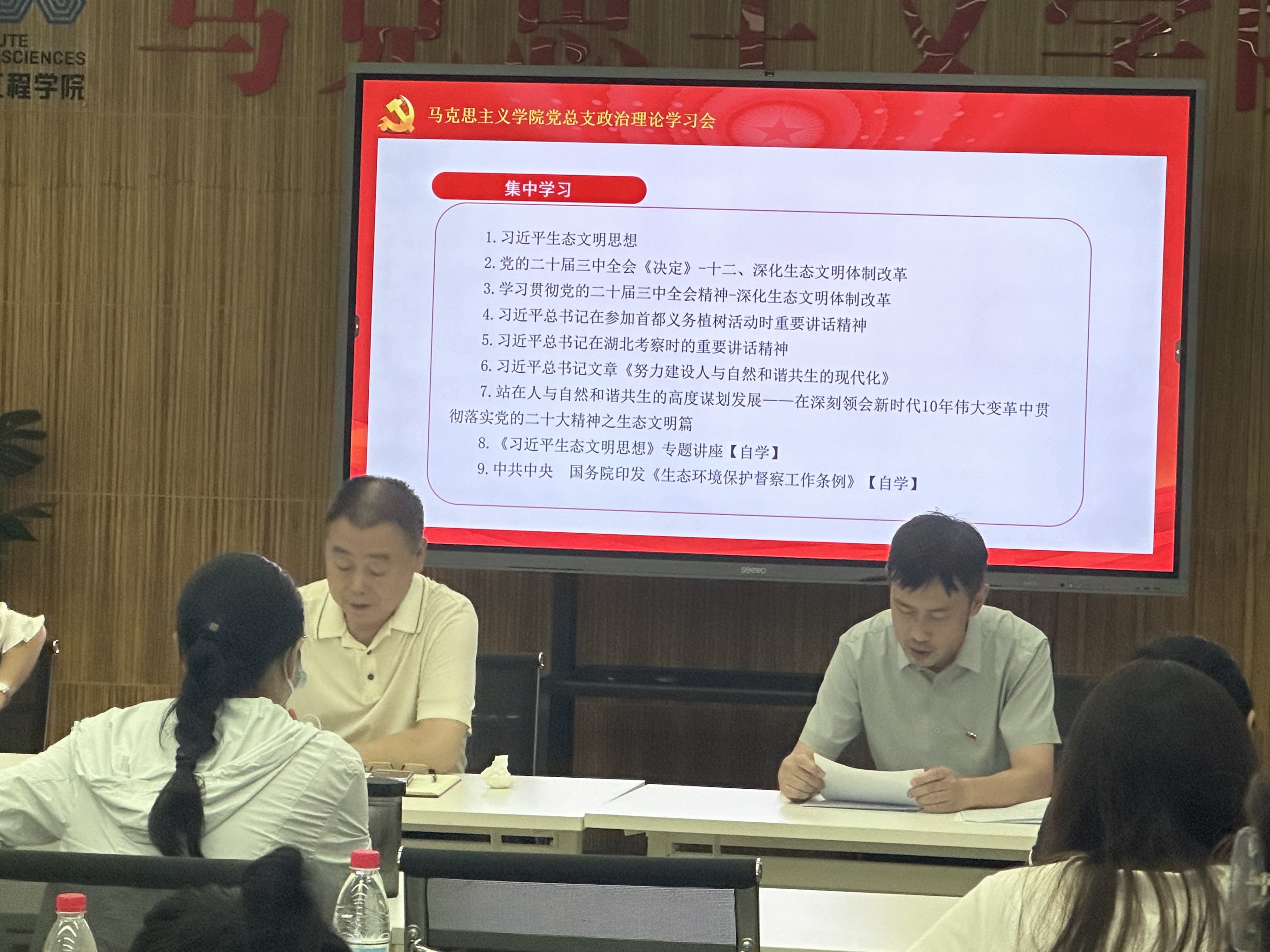 会议伊始,柯峰领学《习近平生态文明思想》及党的二十届三中全会《决定》中“深化生态文明体制改革”相关内容。他强调,新时代十年生态文明建设取得的历史性成就,根本在于习近平总书记掌舵领航,在于习近平生态文明思想的科学指引。全体教师要从“站在人与自然和谐共生高度谋划发展”的战略高度,深刻把握生态文明建设的政治性、系统性、科学性,将“绿水青山就是金山银山”理念融入思政课教学与科研全过程。