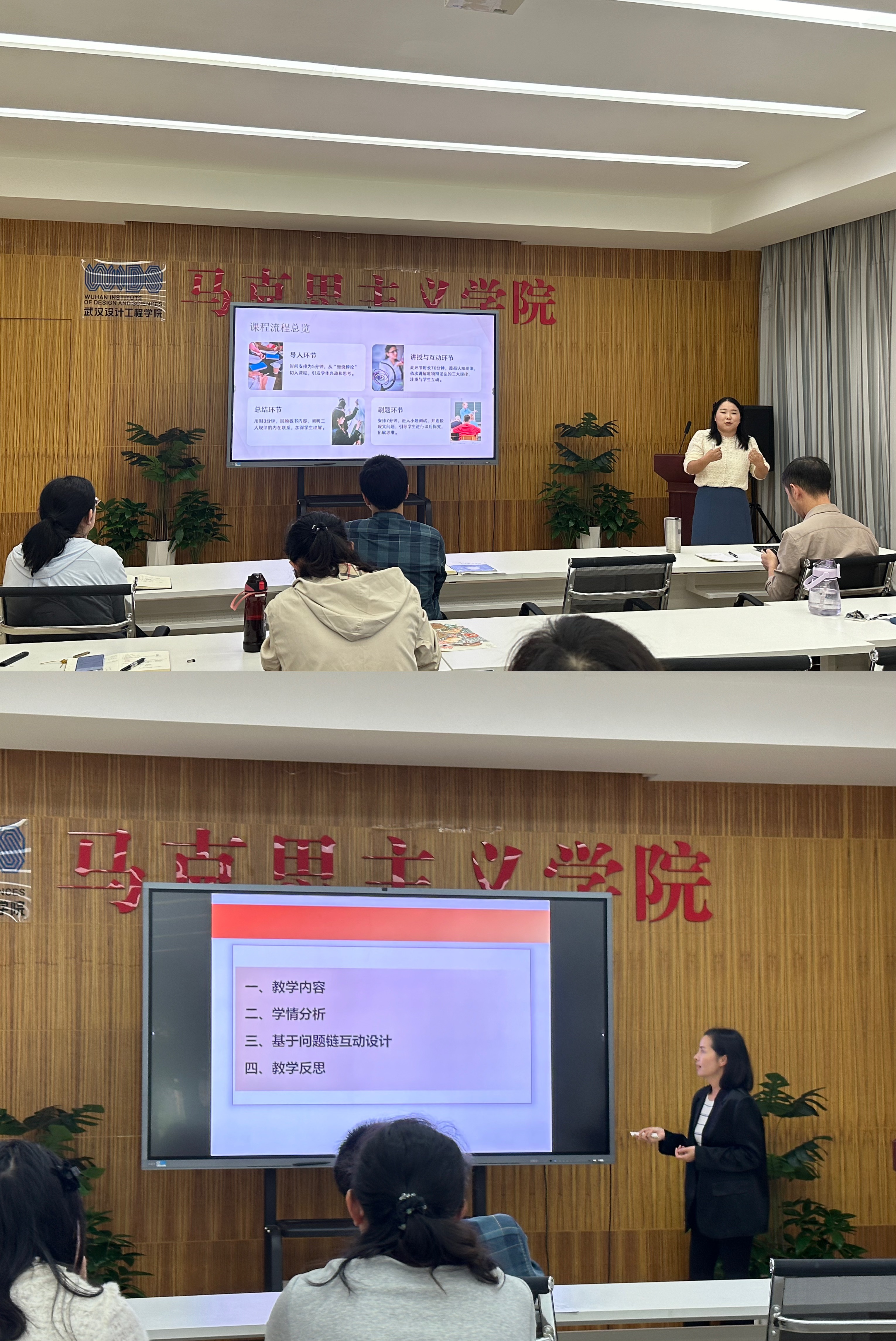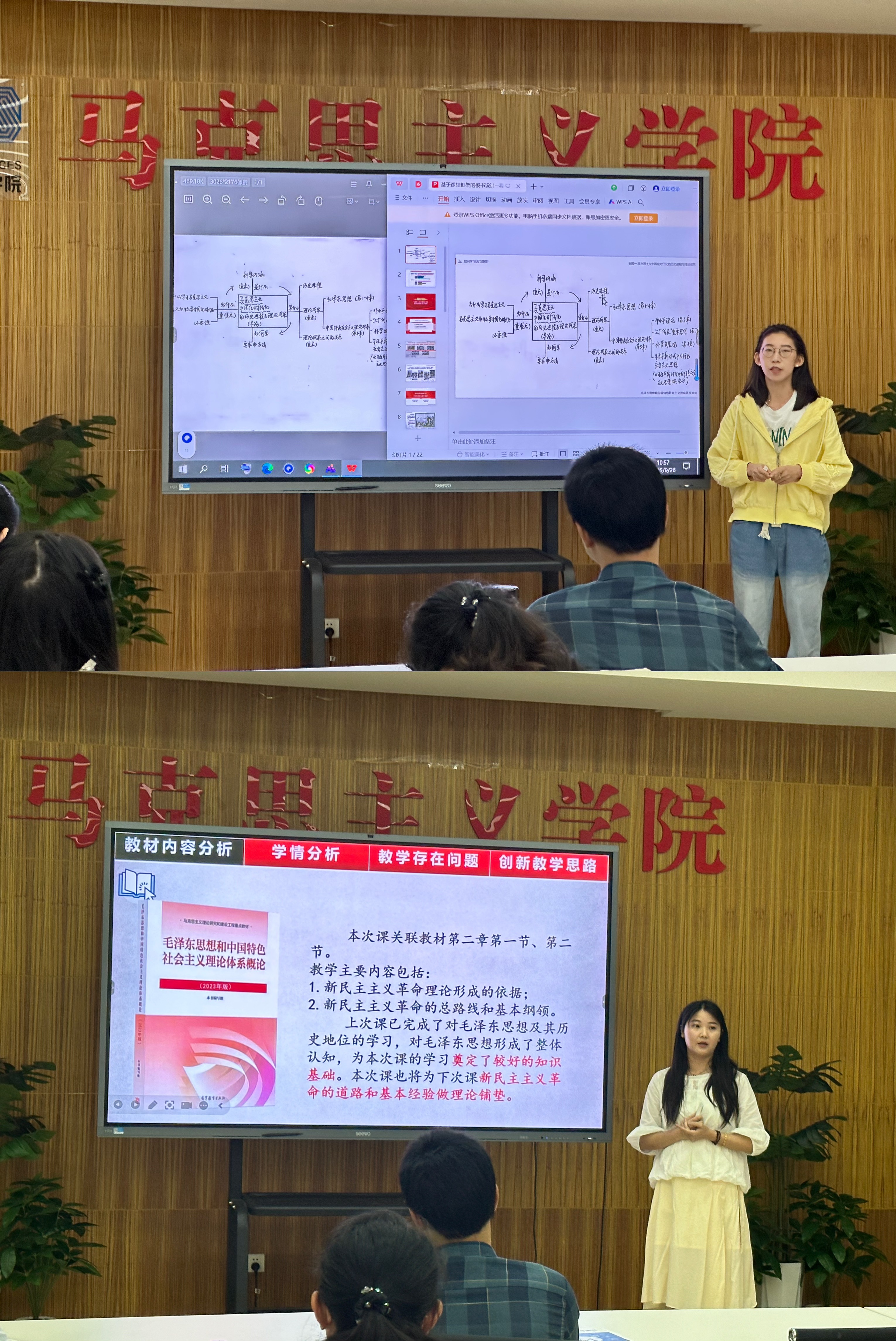 毛泽东思想和中国特色社会主义理论体系概论教研室何哲老师通过逻辑框架图式的板书设计,直观展示了《马克思主义为什么要中国化时代化》的深刻内涵。席吕思老师则围绕《新民主主义革命理论》,分享了问题链式的有效互动设计和基于学习动词的教学流程设计,明确了师生在课堂上的具体活动,为提升课堂互动性提供了新思路。