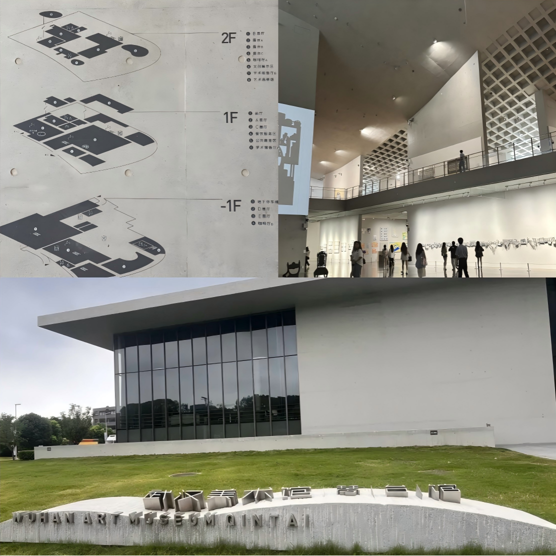 武汉美术馆(琴台馆)外观、内部和楼层功能布局。