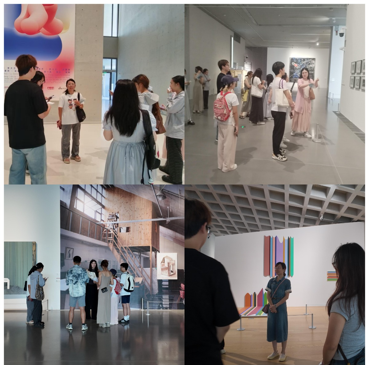 师生们重点考察了美术馆的公共开放空间、无障碍设施等功能区域,细致观察和体验了空间布局中所体现的人文关怀与以人民为中心的设计理念。教师们将美术馆的建设与发展置于国家战略和武汉城市总体规划的宏观背景中,引导员工深入思考公共文化设施在服务人民美好生活、提升城市文化软实力方面所承担的重要角色。与此同时,同学们结合各自专业视角,分析了空间设计如何体现便利性、包容性与人文性,深切感受到“人民城市人民建,人民城市为人民”理念在现实中的生动实践。通过将现场体验与国家发展理念相联结,大家进一步理解了专业学习与中国式现代化建设之间的内在联系,增强了将个人成长融入国家发展大局的自觉意识和使命担当。