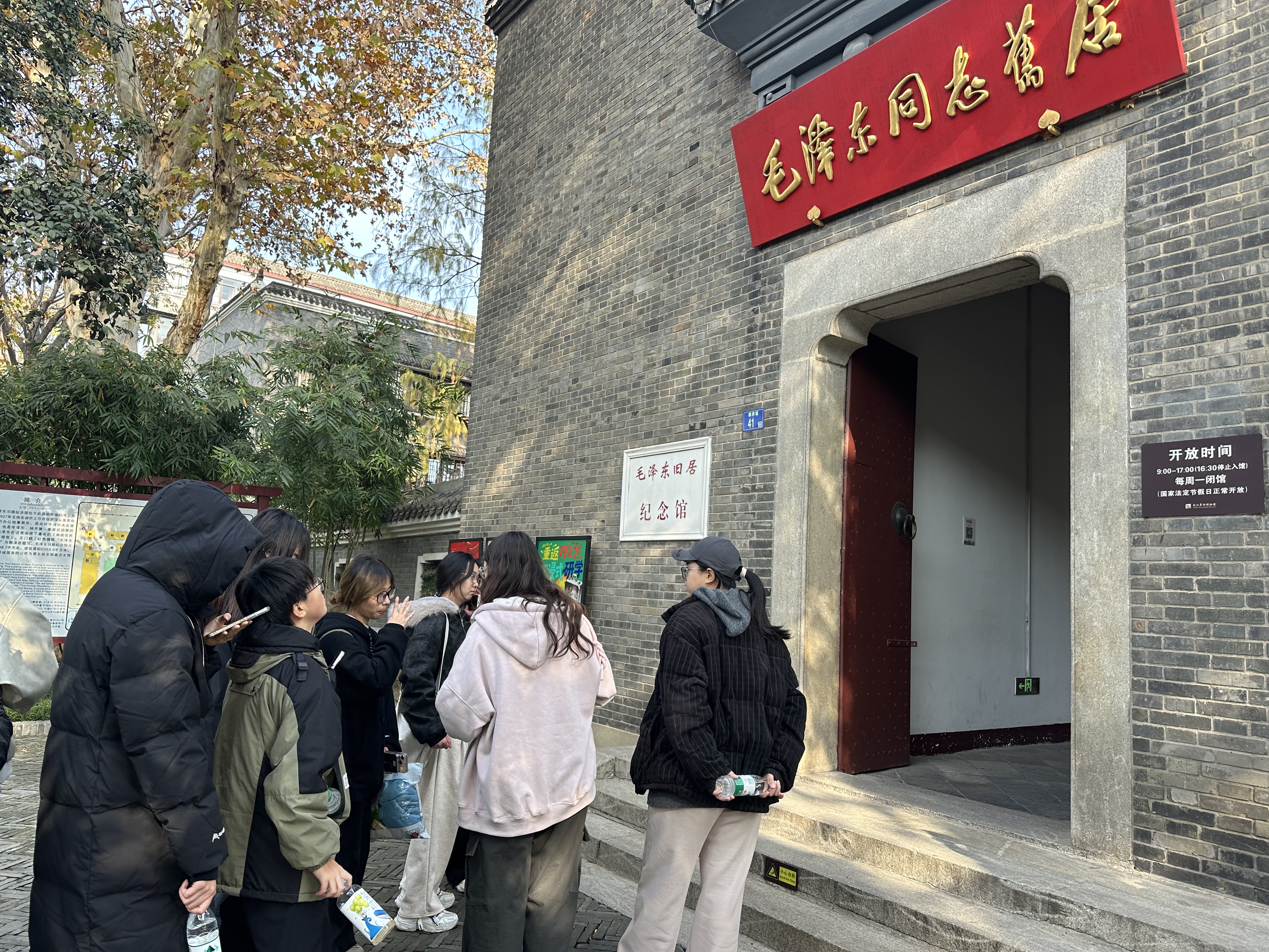 行至都府堤41号毛泽东同志旧居,师生们走进毛泽东同志1927年撰写《湖南农民运动考察报告》的简陋书房。教师重点讲述了青年毛泽东深入农村、徒步调研32天的史实,剖析其“没有调查就没有发言权”的思想精髓。员工们驻足于油灯文稿前,细细体会革命领袖在白色恐怖下坚持真理、探索道路的坚定信念。视传2504班朱晓同学感慨道:“看到桌椅上岁月留下的痕迹,我才真正懂得,伟人的思想不是凭空而来,而是扎根泥土、心系百姓的结晶。”