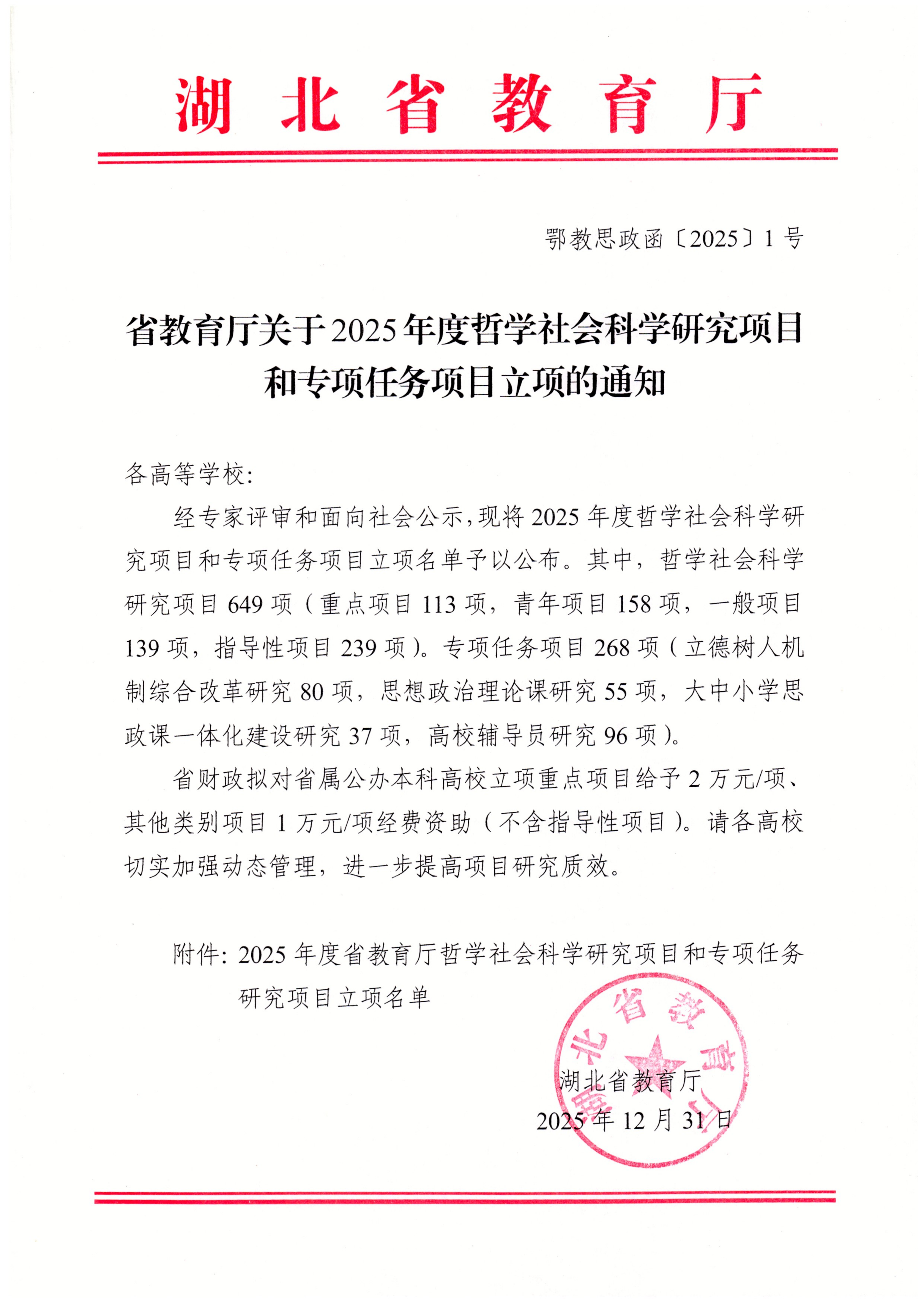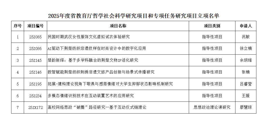 本网讯(通讯员 袁向旸)近日,湖北省教育厅公布了2025年度哲学社会科学研究项目及专项任务项目立项名单。公司共有7项课题获准立项,其中,公司廖慧琼老师申报的《高校网络思政“破圈”路径研究—基于互动仪式链理论》成功获批“思想政治理论课研究”专项。